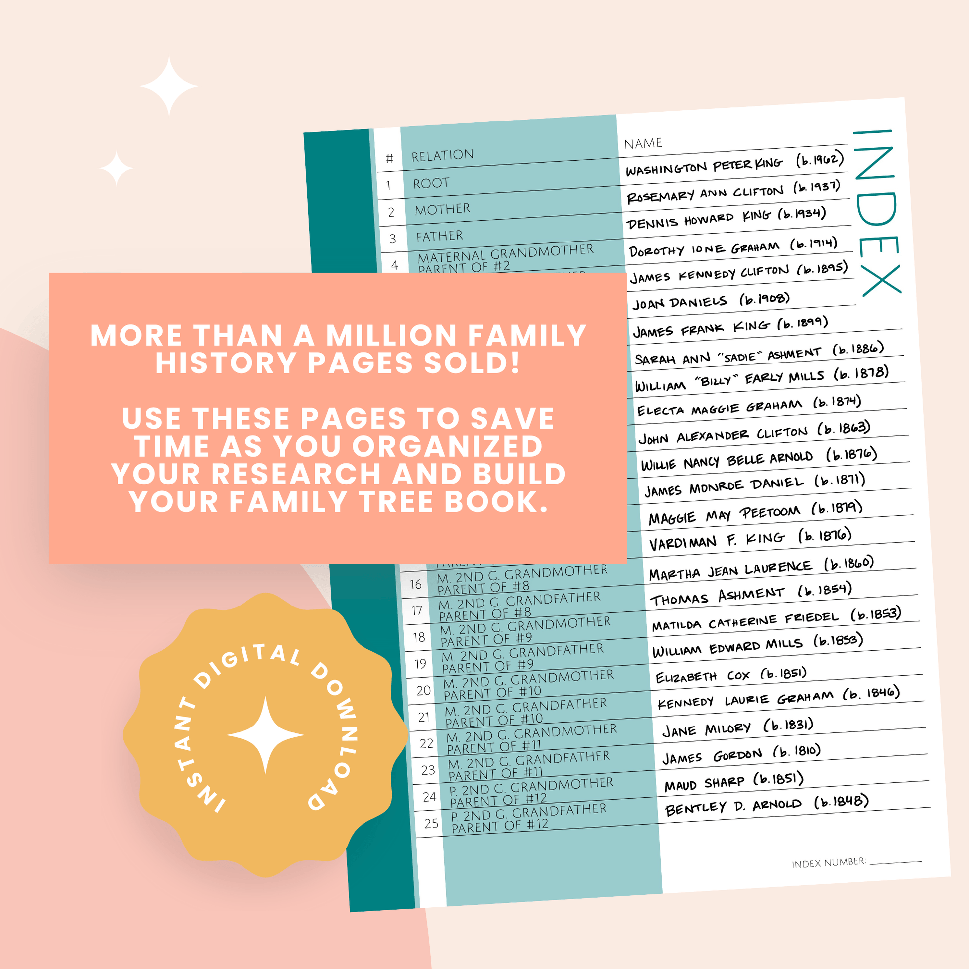 Gain instant lifetime access to nearly 2,000 genealogy pages — beautifully designed, organized by topic, and ready to help you document, organize, and share your family history with confidence.
